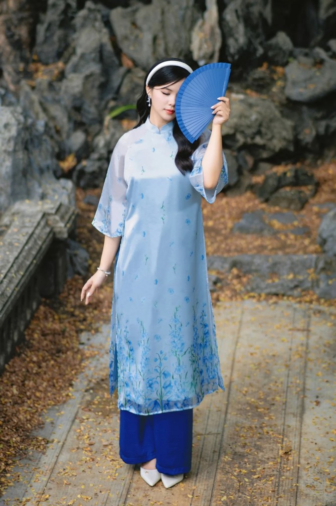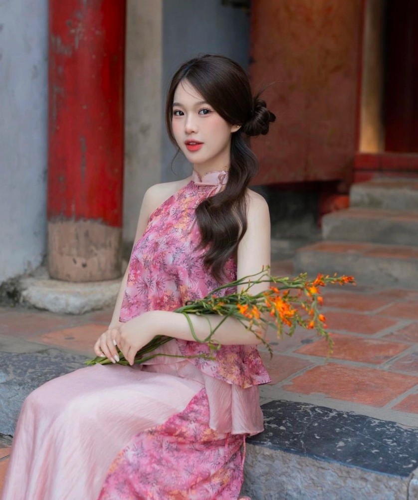 Kiểu tạo dáng này rất phù hợp với áo dài có chất liệu mềm mại, màu sắc nhẹ nhàng hoặc họa tiết hoa xuân tinh tế.