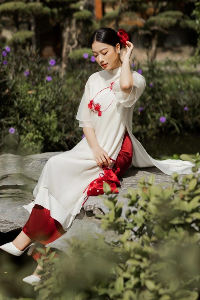 Bạn có thể ngồi trên ghế gỗ, bậc thềm hoặc chiếu Tết, hai chân xếp gọn sang một bên, lưng thẳng và vai thả lỏng. Tay đặt nhẹ trên đùi hoặc cầm phụ kiện như hoa, quạt để tạo điểm nhấn. Ánh mắt nên hướng về phía ống kính hoặc nhìn nghiêng để tạo cảm giác thư thái, tự nhiên.