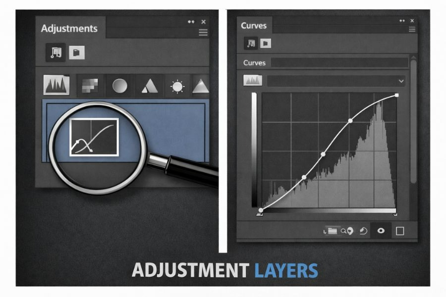 Adjustment Layers (layer điều chỉnh) là công cụ cực kỳ quan trọng giúp bạn thay đổi độ sáng, độ tương phản, màu sắc hay tông ảnh mà không tác động trực tiếp lên file gốc. Thay vì chỉnh sửa “đè” lên hình, mọi thay đổi sẽ được đặt trên một layer riêng biệt. Bạn thậm chí có thể chồng nhiều layer điều chỉnh cùng lúc để kiểm soát màu sắc và ánh sáng một cách linh hoạt, chuyên nghiệp hơn.