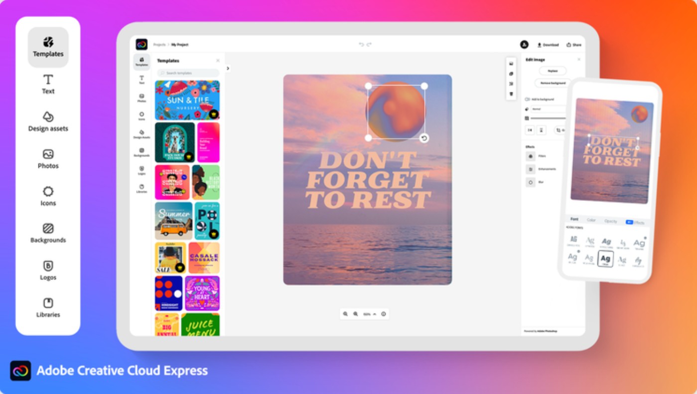 Adobe Express cho phép người dùng truy cập vào hàng nghìn template chuyên nghiệp, hiệu ứng ảnh nâng cao, bộ sưu tập ảnh miễn phí bản quyền cùng hơn 2.000 phông chữ độc đáo. Dù bạn thiết kế trên nền tảng web, máy tính bảng hay smartphone, trải nghiệm đều được đồng bộ, mượt mà.