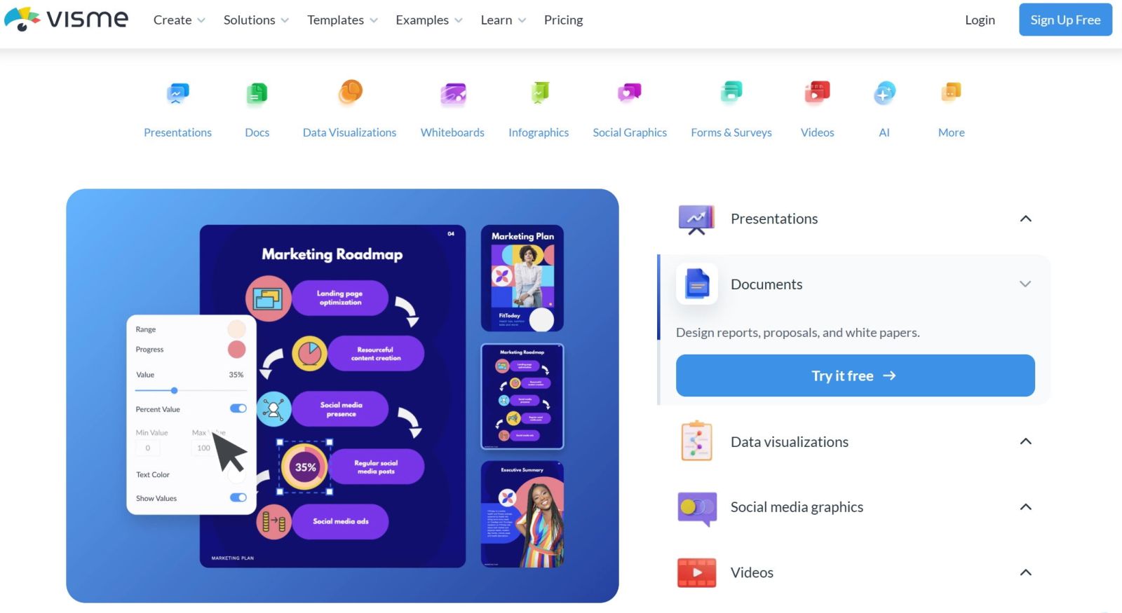 Nếu bạn thường xuyên làm báo cáo, thuyết trình, dữ liệu trực quan hoặc infographic, Visme sẽ là lựa chọn tối ưu hơn Canva. Không chỉ cung cấp template, Visme còn cho phép người dùng thêm biểu đồ, bản đồ, widget dữ liệu, video và các yếu tố tương tác khác vào slide thuyết trình.