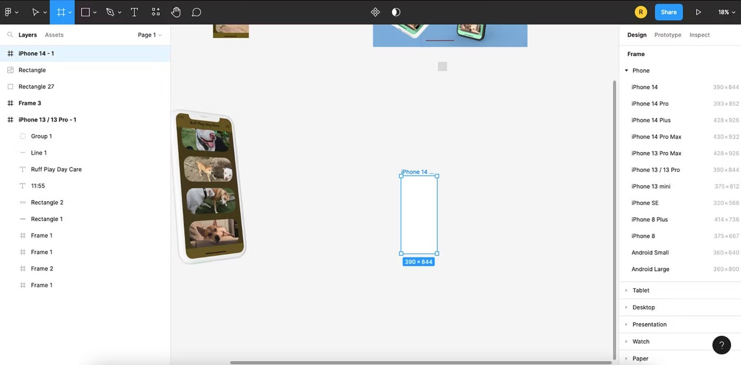 Phím F sẽ mở ngay công cụ Frame để bạn có thể vẽ khung mới trực tiếp lên canvas. Ngoài việc vẽ thủ công, bạn còn có thể nhập chính xác kích thước mong muốn trong bảng thuộc tính bên phải. Điều này đẩy nhanh quá trình tạo artboard chuẩn cho từng thiết bị, chẳng hạn như iPhone, Web, Android hoặc thậm chí là custom frame cho nội dung đặc thù.