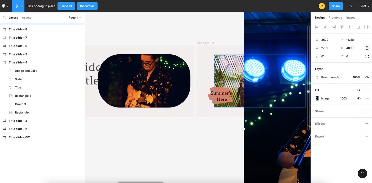 Figma hỗ trợ Cmd + Shift + K (Mac) hoặc Ctrl + Shift + K (Windows) để mở hộp thoại chọn hình và cho phép bạn đặt nhiều ảnh cùng lúc. Khi đã chọn hình, bạn chỉ cần click vào từng placeholder hoặc bất kỳ vùng trống nào để Figma tự phân phối từng ảnh theo thứ tự.