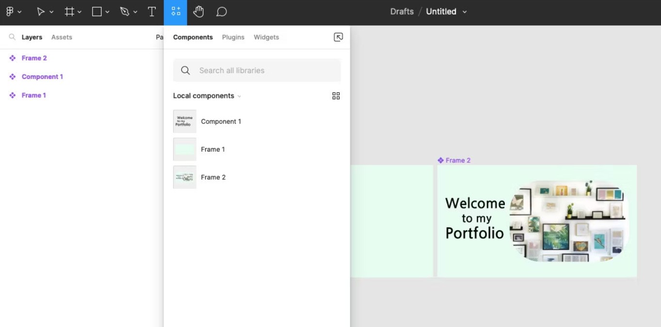 Tab Resources tập trung các thành phần quan trọng bao gồm Components, Plugins và Widgets. Đây là nơi bạn sẽ truy cập rất thường xuyên khi xây dựng thư viện thiết kế hoặc cần cài plugin mới.