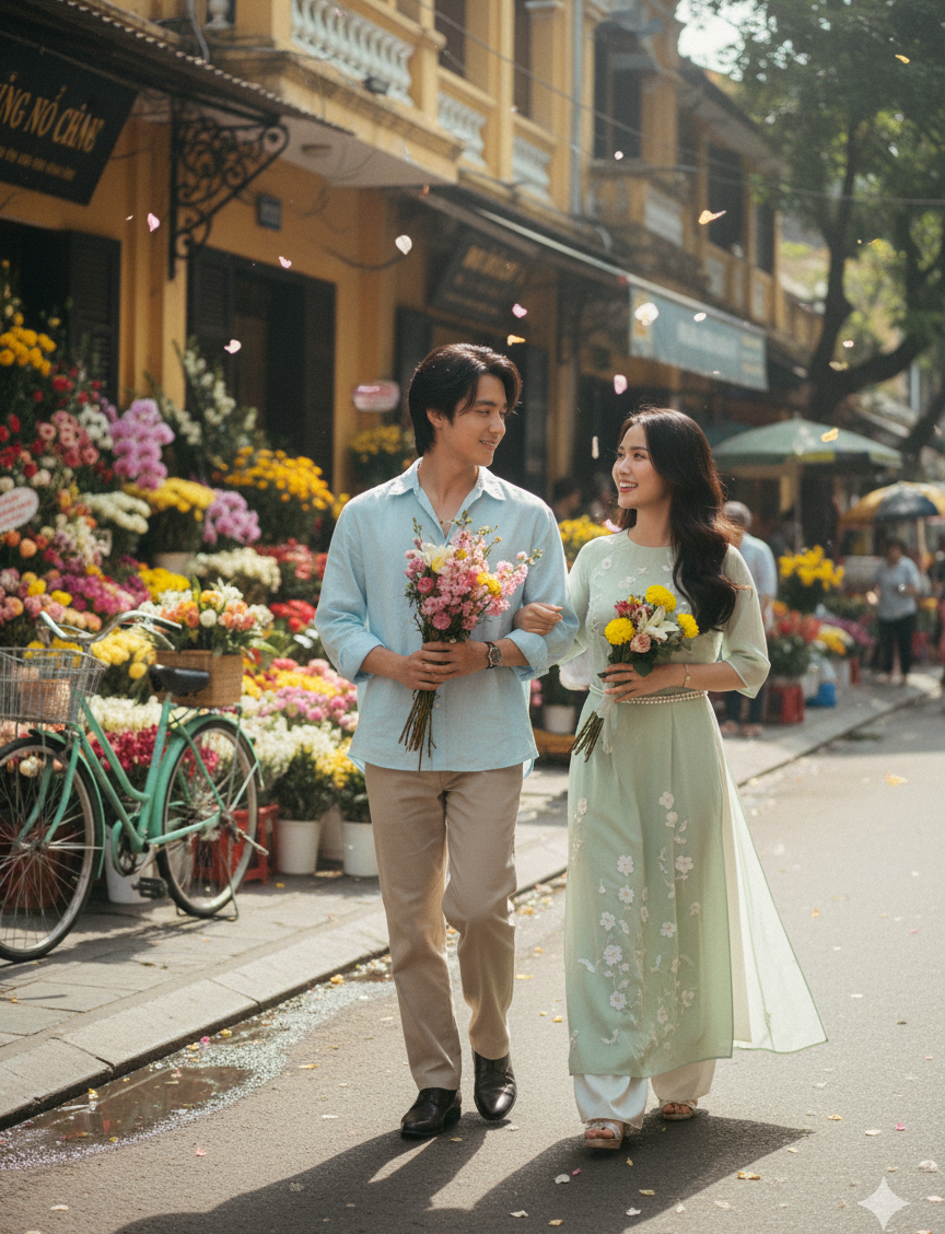 Tạo ảnh phong cách hiện đại, tự nhiên của cặp đôi đi dạo trên phố Hà Nội ngập tràn hoa tươi. Cả hai mặc áo dài cách tân màu pastel. Ảnh có ánh sáng tự nhiên, bắt khoảnh khắc cười đùa và hiệu ứng chuyển động nhẹ để tạo cảm giác chân thật. Giữ nguyên khuôn mặt như trong ảnh đã tải lên.