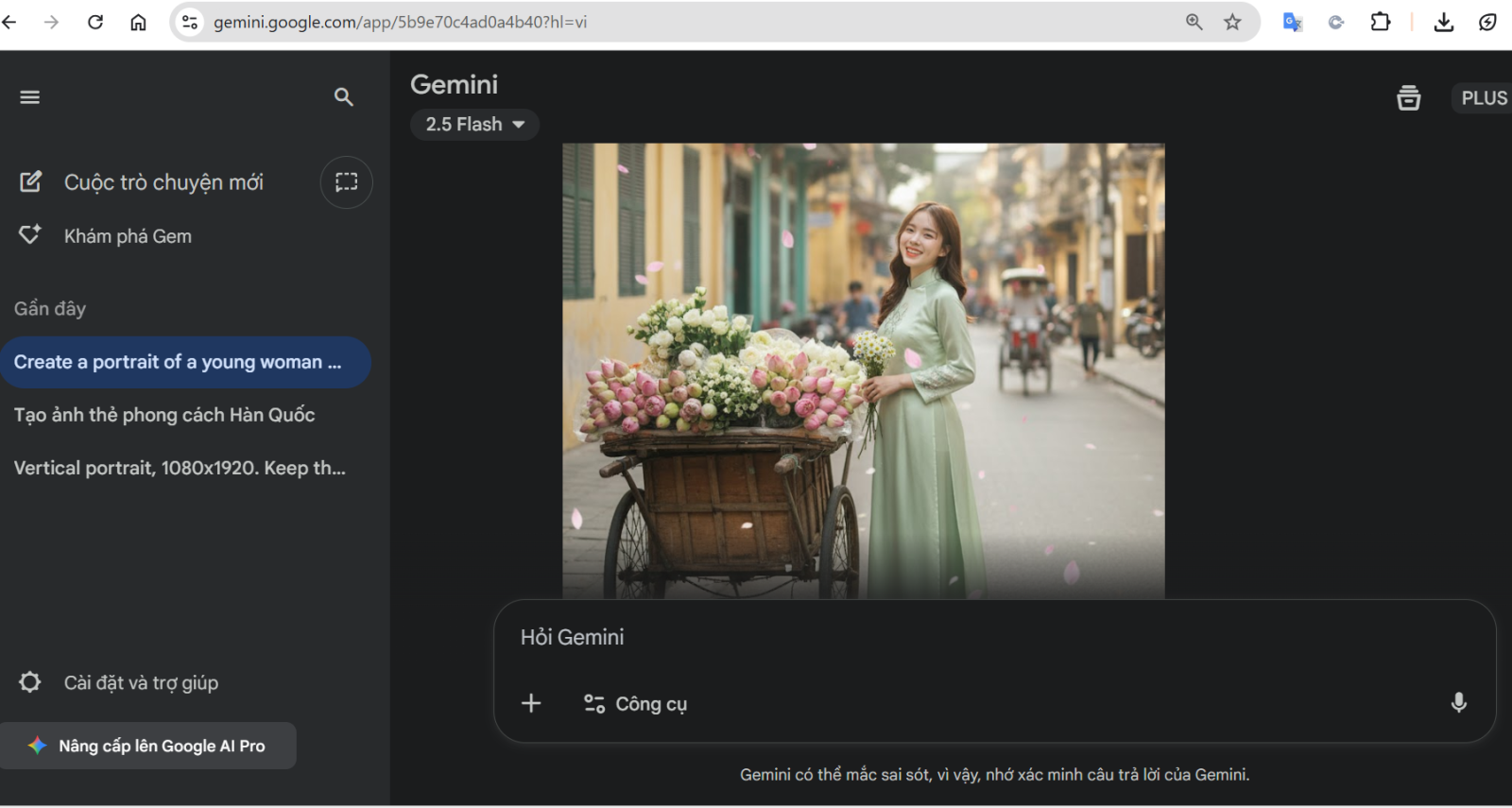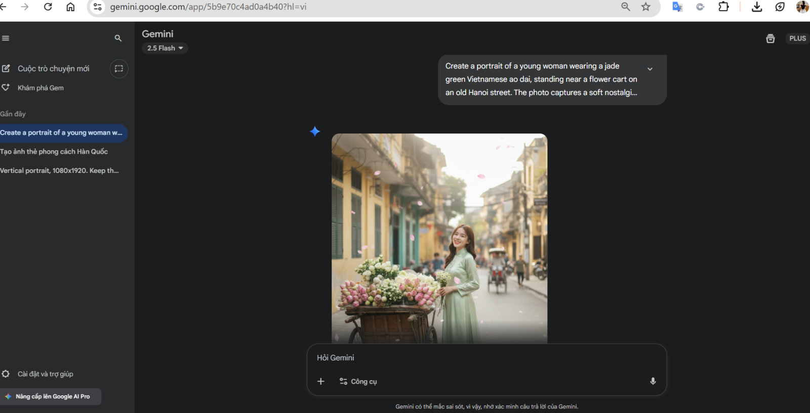 Phiên bản Gemini Pro không chỉ mang đến độ chi tiết vượt trội mà còn hiểu ngữ cảnh cực tốt. Khi bạn mô tả “cô gái Hà Nội bên xe hoa cúc họa mi trong nắng sớm”, Gemini Pro sẽ tái hiện ánh sáng, màu da, chất liệu vải áo dài và cảm xúc khuôn mặt cực tự nhiên - điều mà các bản AI miễn phí thường làm mờ hoặc sai tone.
