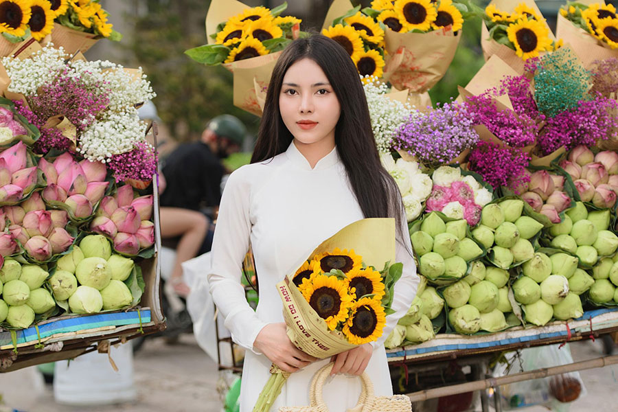 Những đóa cúc họa mi trắng muốt, bó sen hồng khẽ nghiêng mình trong gió hay những chùm hoa giấy đung đưa bên hiên nhà - tất cả hòa quyện tạo nên một bản giao hưởng sắc màu rất riêng của Hà thành. Chỉ một khoảnh khắc dừng lại bên xe hoa, tà áo dài bay nhẹ, hay nụ cười hiền giữa phố cũng đủ khiến bức ảnh trở nên đầy cảm xúc.
