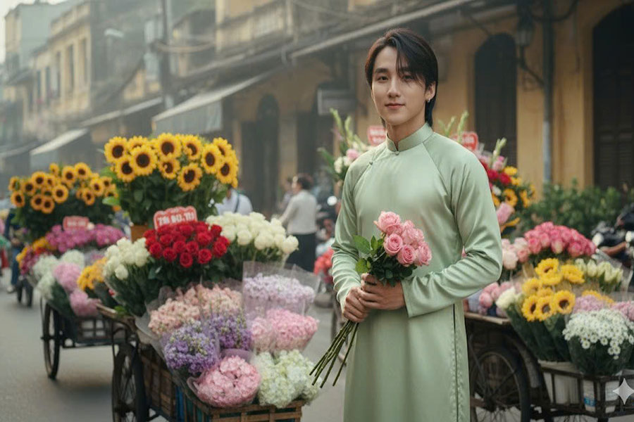 Tạo ảnh chân dung điện ảnh của một chàng trai trẻ mặc áo dài xanh pastel, đứng trên con phố Hà Nội vào buổi sáng sớm. Phía sau là những xe hoa đầy hoa hồng, cúc và baby trắng. Ánh sáng nhẹ nhàng, mang tông phim Fujifilm. Chàng trai mỉm cười nhẹ, nhìn hơi lệch khỏi ống kính. Giữ nguyên khuôn mặt như trong ảnh đã tải lên.
