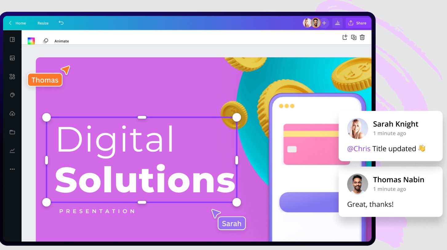Tính năng cộng tác thời gian thực là một trong những yếu tố làm nên sự khác biệt của Canva. Trong thời đại mà mọi người có thể làm việc từ bất kỳ nơi nào, từ văn phòng đến quán cà phê hay thậm chí là trên xe, khả năng kết nối liên tục giữa các thành viên trở nên vô cùng quan trọng.