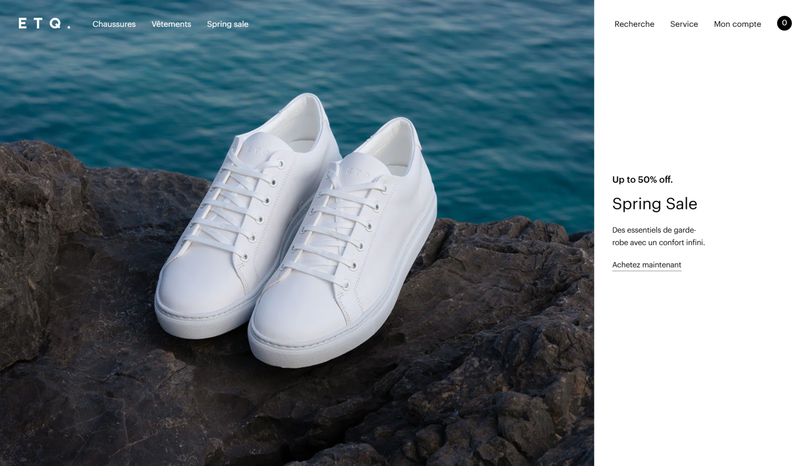 ETQ là một công ty giày và nó sử dụng phông nền trần và những bức ảnh chụp chi tiết, tuyệt vời để thực sự làm nổi bật sản phẩm của họ. Hãy xem những món đồ bình thường có thể trông phi thường như thế nào khi có nhiếp ảnh, ánh sáng và thiết kế phù hợp. Hình ảnh động chữ đơn giản nhưng hiệu ứng giúp làm nổi bật từng sản phẩm. Tất cả những yếu tố này cho phép thiết kế thương mại điện tử rất tối giản của trang web hoạt động tốt cho khách truy cập.
