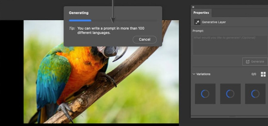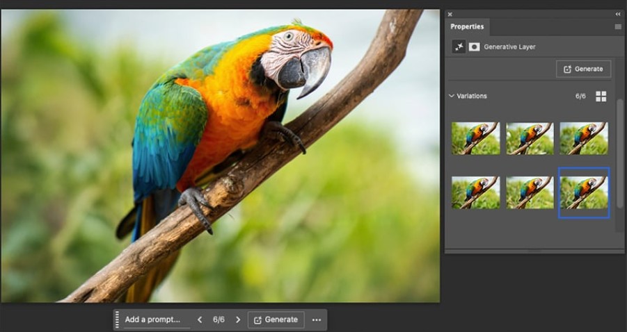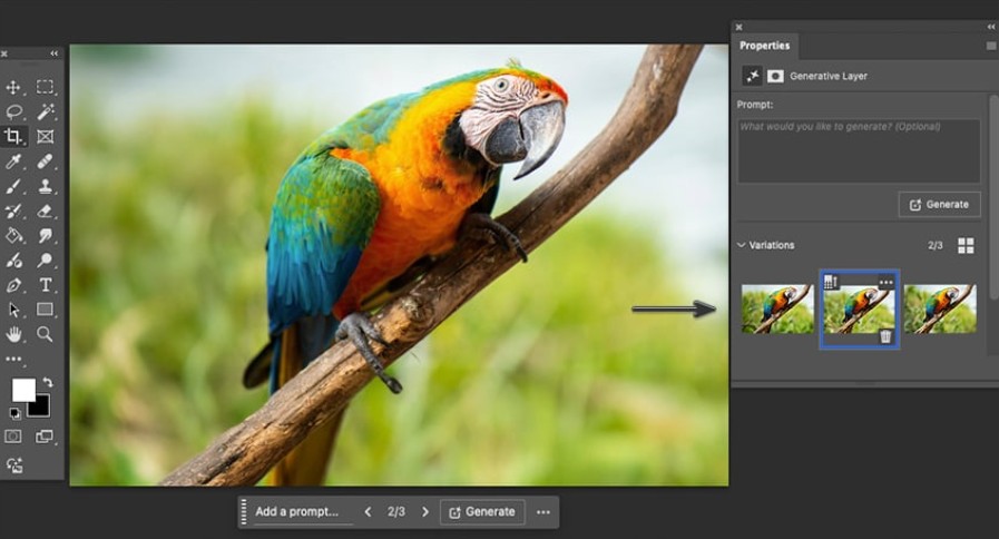 Chỉ sau vài giây, Photoshop sẽ tạo ra ba phiên bản mở rộng phông nền khác nhau. Những phiên bản này sẽ xuất hiện trong bảng Properties, tại mục Generative Layer.
