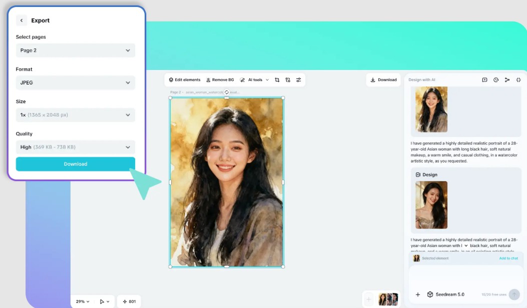 Khi đã hoàn thiện nhân vật, bạn có thể xuất hình ảnh với độ phân giải cao để sử dụng trên nhiều nền tảng khác nhau. CapCut hỗ trợ nhiều định dạng và kích thước, giúp bạn dễ dàng tích hợp nhân vật vào các dự án như video, bài đăng mạng xã hội hoặc tài liệu trình bày. Ngoài ra, các công cụ bổ sung giúp bạn tối ưu hóa hình ảnh, đảm bảo rằng sản phẩm cuối cùng luôn đạt chất lượng tốt nhất.