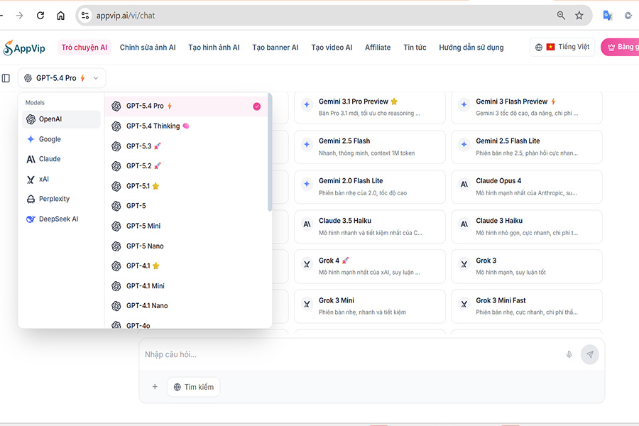 Appvip tích hợp nhiều AI mạnh như ChatGPT, Claude, Gemini, Grok, Perplexity, DeepSeek… hỗ trợ lập trình, xử lý nội dung và tối ưu công việc hiệu quả. 1 tài khoản - dùng toàn bộ hệ sinh thái AI