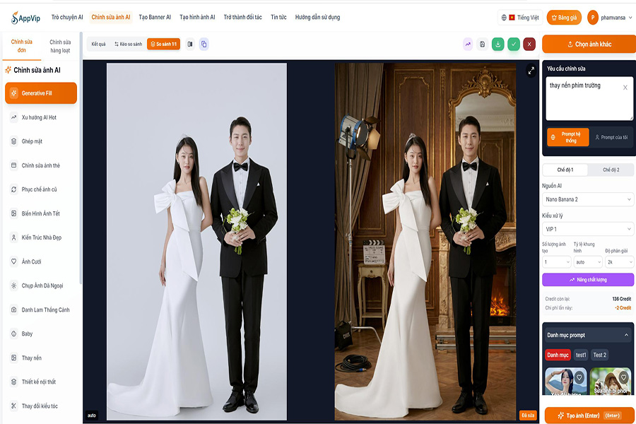 Bên cạnh đó, appvip.ai còn tích hợp Các tính năng nâng cao gồm: Chỉnh sửa ảnh cưới, thay nền, Chỉnh ảnh thẻ, Phục Chế Ảnh cũ, thay trang phục, ghép mặt, ghép dáng, tái tạo chi tiết tự nhiên, giữ nguyên bố cục và nét mặt cũ không bị thay đổi hay biến dạng. Công nghệ “phục chế ảnh cũ al, ảnh mờ, ảnh thiếu chi tiết” giúp khôi phục hình ảnh sắc nét, rõ ràng và chuyên nghiệp hơn.