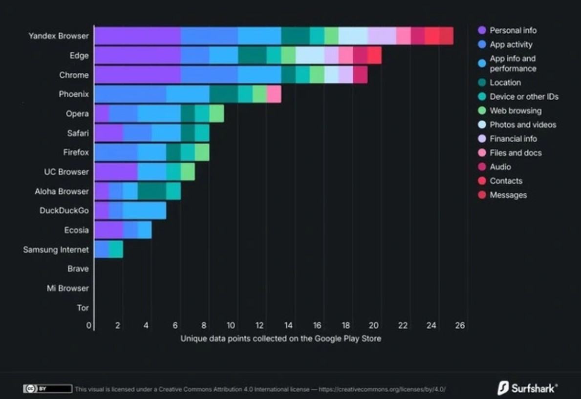 Đứng đầu bảng xếp hạng là Yandex, trình duyệt phổ biến tại Nga, với mức độ thu thập lên tới 25/38 loại dữ liệu có thể. Con số này không chỉ cao, mà còn phản ánh một chiến lược khai thác dữ liệu toàn diện đến mức đáng lo ngại.