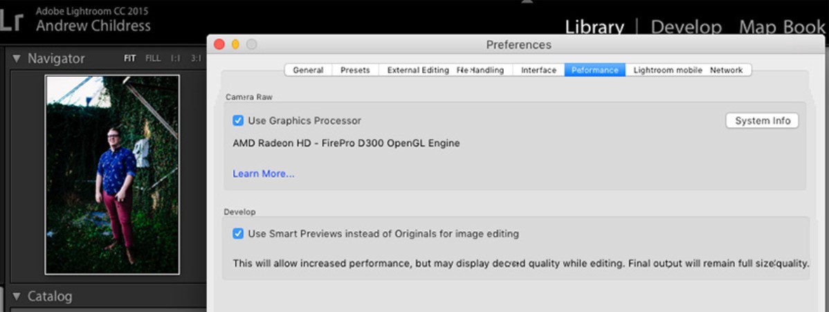 Trước hết, hãy vào Preferences > Performance và thử tắt tùy chọn Use Graphics Processor nếu bạn đang sử dụng máy tính với GPU tích hợp hoặc card đồ họa đời cũ. Nhiều người dùng nhận thấy việc tắt tùy chọn này khiến Lightroom chạy mượt hơn đáng kể.