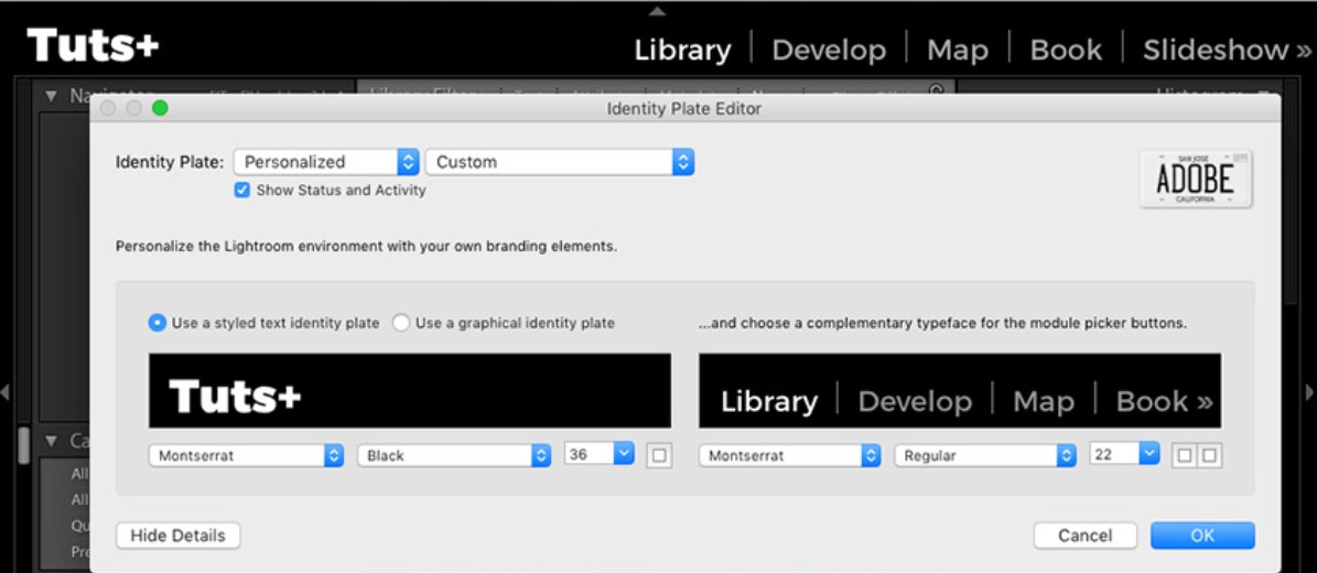 Một cách thú vị để cá nhân hóa Lightroom chính là thêm logo hoặc thương hiệu cá nhân vào giao diện phần mềm. Lightroom cho phép bạn làm điều này thông qua tính năng Identity Plate.