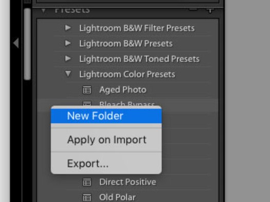 Để tạo một thư mục mới, bạn chỉ cần nhấp chuột phải trong bảng Presets và chọn New Folder, sau đó đặt tên phù hợp. Khi đã có hệ thống rõ ràng, bạn sẽ thấy việc tìm kiếm và áp dụng preset trở nên nhanh hơn rất nhiều. Đây cũng là cách giúp bạn giữ cho Lightroom luôn gọn gàng và chuyên nghiệp, nhất là khi bạn sở hữu một thư viện preset khổng lồ.