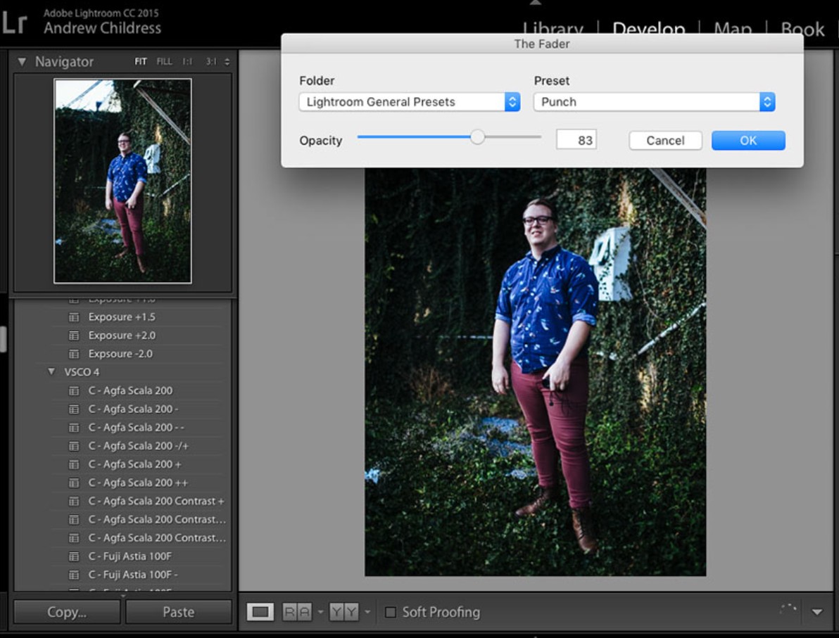 Plugin này cho phép bạn giảm cường độ của preset giống như giảm độ mờ (opacity) của một lớp trong Photoshop. Sau khi tải và cài đặt The Fader bằng cách vào File > Plug-In Manager, bạn có thể truy cập nó trong menu File > Plug-in Extras > The Fader.