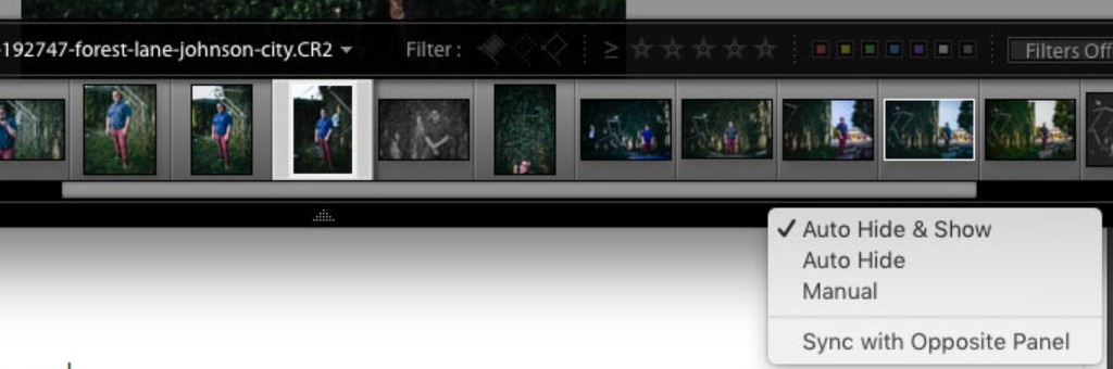 Chỉ cần nhấp chuột phải vào filmstrip hoặc bảng bên trái, bên phải, sau đó chọn Auto Hide & Show. Khi bật tính năng này, các bảng sẽ tự động ẩn đi khi bạn không dùng đến, chỉ xuất hiện lại khi bạn rê chuột vào khu vực đó. Nhờ vậy, màn hình của bạn trở nên thông thoáng hơn, giúp bạn tập trung hơn vào quá trình chỉnh sửa ảnh.