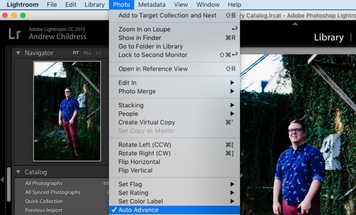 Nếu bạn không muốn sử dụng phím Caps Lock, có thể bật hoặc tắt Auto Advance thủ công bằng cách truy cập menu Photo > Auto Advance. Một khi đã quen với tính năng này, bạn sẽ nhận ra nó giúp cải thiện tốc độ làm việc lên gấp nhiều lần, đặc biệt hữu ích khi xử lý hàng nghìn bức ảnh trong các buổi chụp lớn.