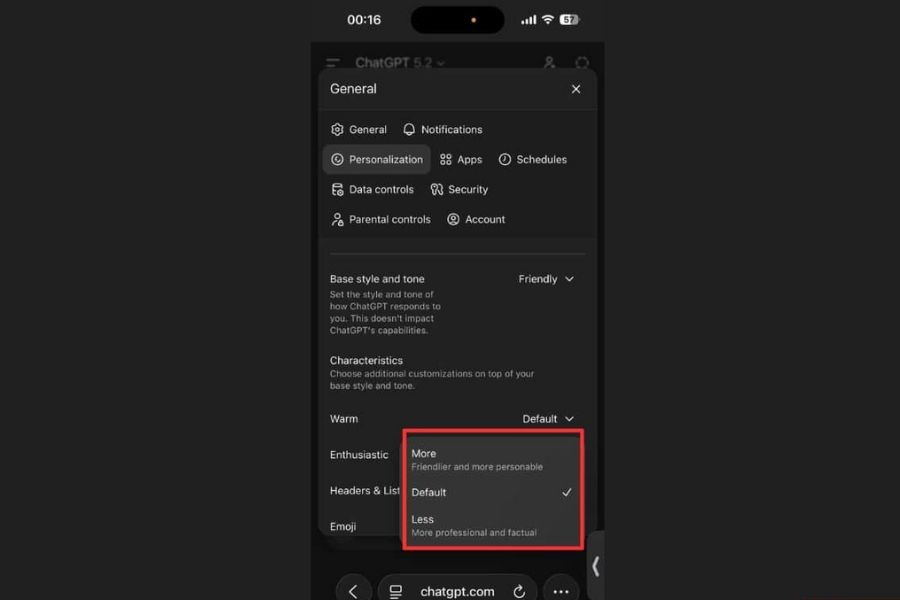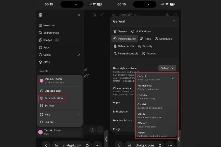 Nếu bạn thường xuyên sử dụng ChatGPT trên smartphone, việc chỉnh giọng điệu và tính cách của AI vẫn được hỗ trợ đầy đủ thông qua tính năng Personalization. Các bước thực hiện trên ứng dụng di động khá tương đồng với phiên bản máy tính, giao diện được tối ưu để thao tác nhanh và thuận tiện hơn.