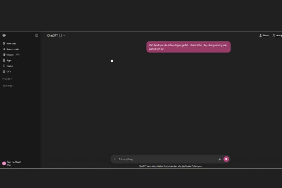 Để văn bản đầu ra tự nhiên và gần với cách viết của con người nhất, bạn nên kết hợp nhiều yếu tố thay vì chỉ trông chờ vào một câu lệnh đơn lẻ. Trước hết, hãy tận dụng tính năng Personalization để thiết lập sẵn một giọng điệu nền phù hợp với phong cách viết bạn thường dùng. Song song với đó, trong từng prompt cụ thể, bạn nên bổ sung các yêu cầu như “sử dụng ngôn ngữ đời thường”, “tránh lặp từ”, “hạn chế từ nối mang tính máy móc” hoặc “viết như người thật đang chia sẻ trải nghiệm”. Quan trọng hơn cả, sau khi có bản nháp từ ChatGPT, bạn nên dành thời gian biên tập lại khoảng 20% nội dung. Việc chỉnh sửa câu chữ, thêm ví dụ cá nhân, cảm xúc thật hoặc cách diễn đạt quen thuộc sẽ giúp bài viết có “hơi thở con người” rõ ràng hơn và giảm cảm giác nội dung do AI tạo ra.