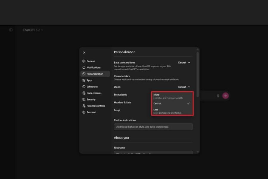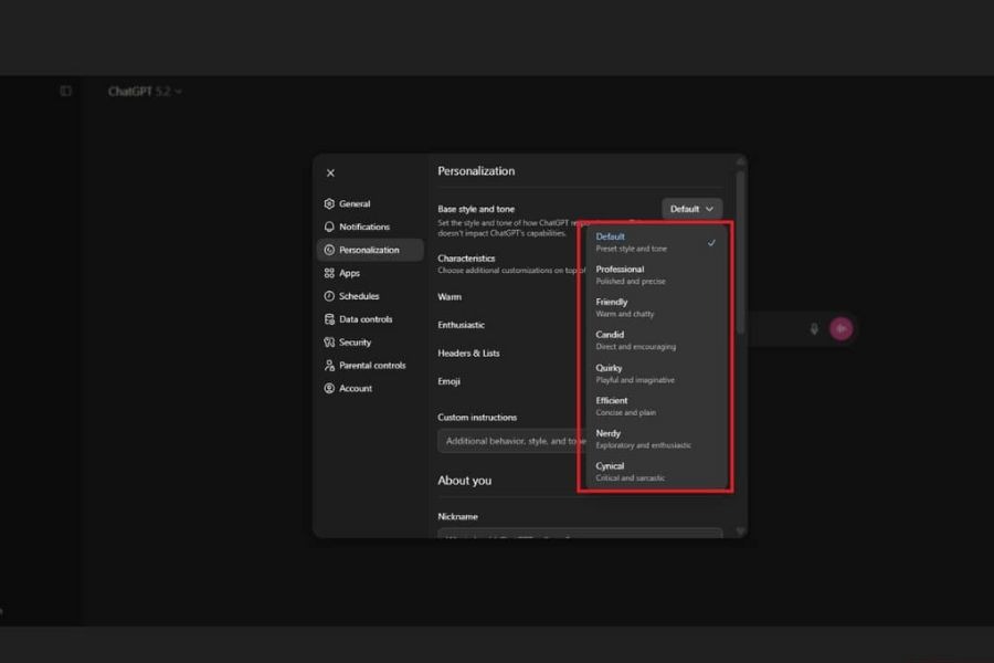 Trong giao diện cài đặt tài khoản, bạn chọn mục Cá nhân hóa (Personalization) để bắt đầu điều chỉnh. Tại đây, trước tiên bạn nên thiết lập phong cách và giọng điệu cơ bản đây là bước quan trọng giúp định hình “tính cách tổng thể” của ChatGPT. Việc lựa chọn giọng điệu phù hợp sẽ ảnh hưởng đến cách AI diễn đạt câu chữ, mức độ trang trọng, cũng như cách tương tác với người dùng trong hầu hết các cuộc trò chuyện hằng ngày.