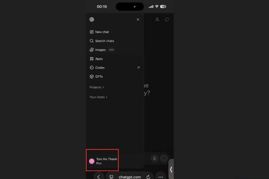 Tại màn hình chính của ứng dụng ChatGPT, bạn nhấn vào biểu tượng hai dấu gạch ngang (Menu) ở góc trên màn hình. Khi danh sách tùy chọn hiển thị, kéo xuống phía dưới và nhấn vào tên tài khoản ChatGPT của bạn. Thao tác này sẽ đưa bạn vào khu vực quản lý tài khoản và các thiết lập cá nhân liên quan đến trải nghiệm sử dụng.