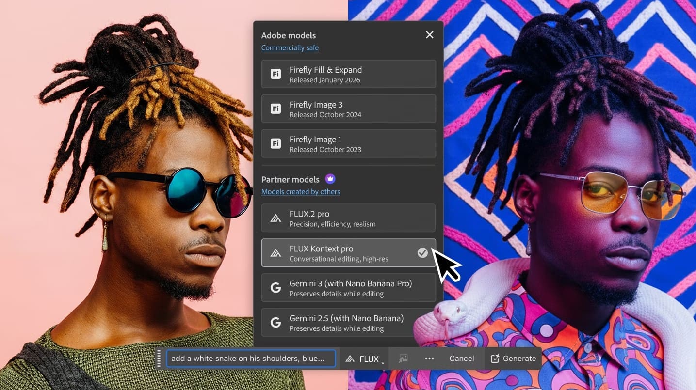 Một trong những thay đổi mang tính chiến lược nhất của Photoshop 2026 chính là việc cho phép người dùng chủ động chọn lựa mô hình AI khi sử dụng các tính năng tạo sinh như Generative Fill và Generative Expand. Trước đây, toàn bộ quá trình này đều phụ thuộc hoàn toàn vào mô hình Firefly mặc định của Adobe. Dù Firefly đã rất mạnh, nhưng việc chỉ có một lựa chọn khiến người dùng khó linh hoạt khi cần những phong cách hoặc cách xử lý hình ảnh khác nhau.