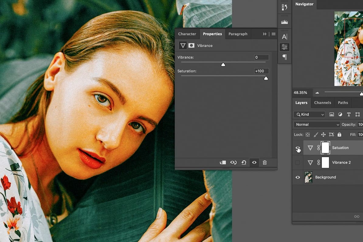 Lớp điều chỉnh này bao gồm các thông số như Nhiệt độ (Temperature), Sắc thái (Tint), Độ rực màu (Vibrance) và Độ bão hòa (Saturation). Việc gom các công cụ này lại giúp quá trình chỉnh màu trở nên trực quan hơn, đặc biệt với những designer không chuyên sâu về color grading nhưng vẫn cần kết quả nhanh và hiệu quả.