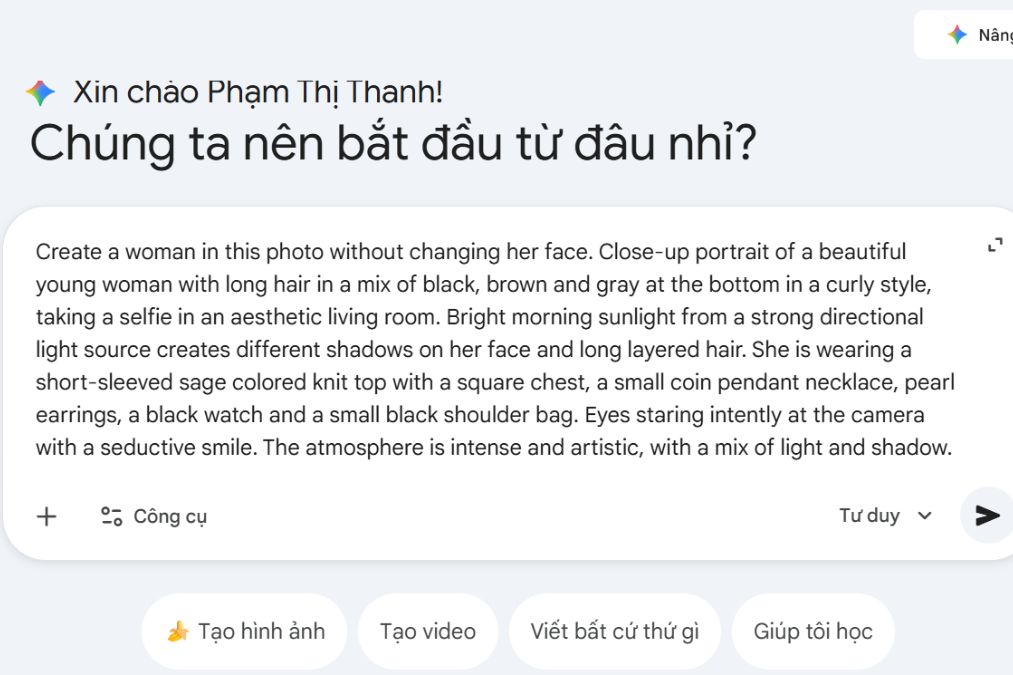 Bạn không cần sử dụng từ ngữ quá phức tạp, chỉ cần mô tả ngắn gọn nhưng đầy đủ ý. Một câu lệnh rõ ràng sẽ giúp Gemini AI hiểu đúng mong muốn của bạn và cho ra kết quả đẹp, tự nhiên, hạn chế tình trạng ảnh bị “ảo” hoặc sai phong cách.