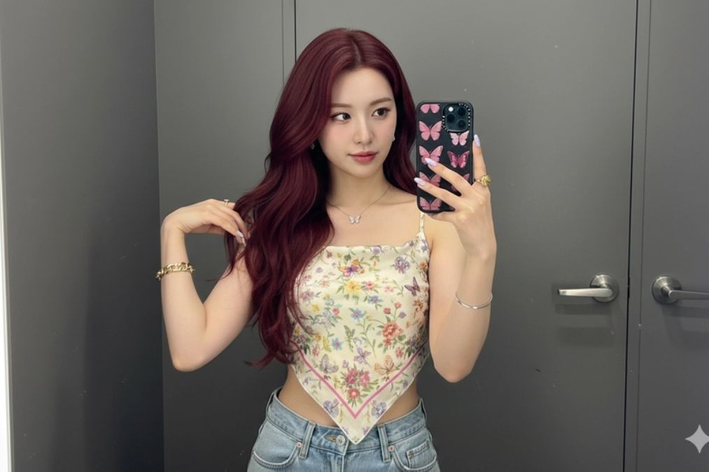 Phong cách này mang vibe trẻ trung, thời thượng, rất phù hợp để đăng Instagram hoặc TikTok. Ánh sáng phòng thử đồ giúp da mịn, dáng đẹp và tổng thể ảnh nhìn rất “xịn” mà vẫn tự nhiên.