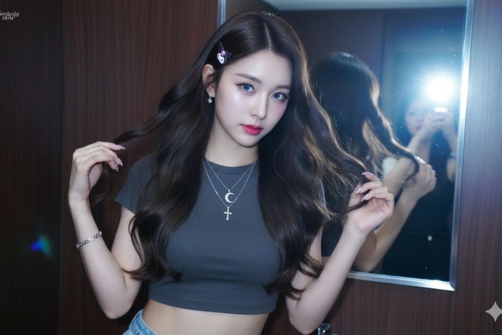 Nếu bạn yêu thích vibe Y2K, retro Nhật – Hàn, thì đây là câu lệnh không thể bỏ qua. Ánh flash mạnh, background phòng tắm gỗ tối và makeup bóng giúp bức ảnh mang đúng tinh thần ảnh kỹ thuật số đầu những năm 2000.