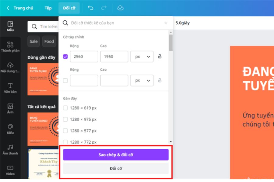 Nhấn Copy & Resize để tạo bản sao mà không làm mất thiết kế gốc.