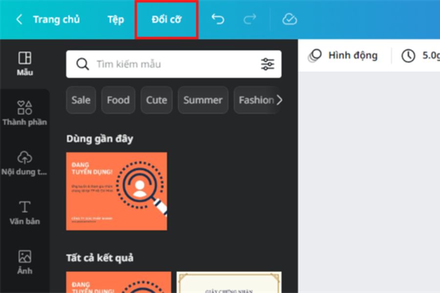 Sau khi mở thiết kế, bạn sẽ thấy tùy chọn Resize trên thanh công cụ phía trên giao diện. Đây là nơi Canva cho phép bạn điều chỉnh chiều rộng và chiều cao của thiết kế một cách linh hoạt. Tính năng này đặc biệt hữu ích khi bạn muốn tạo ra nhiều phiên bản của cùng một thiết kế cho các nền tảng khác nhau.