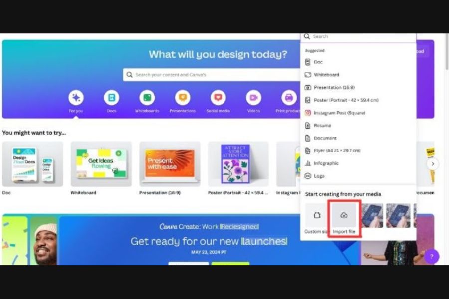 Tại trang chủ Canva, bạn nhấn vào mục Create a design và chọn Import File để tải lên hình ảnh cần chỉnh sửa từ thiết bị. Chỉ mất vài giây, hình ảnh sẽ được đưa vào khung làm việc.