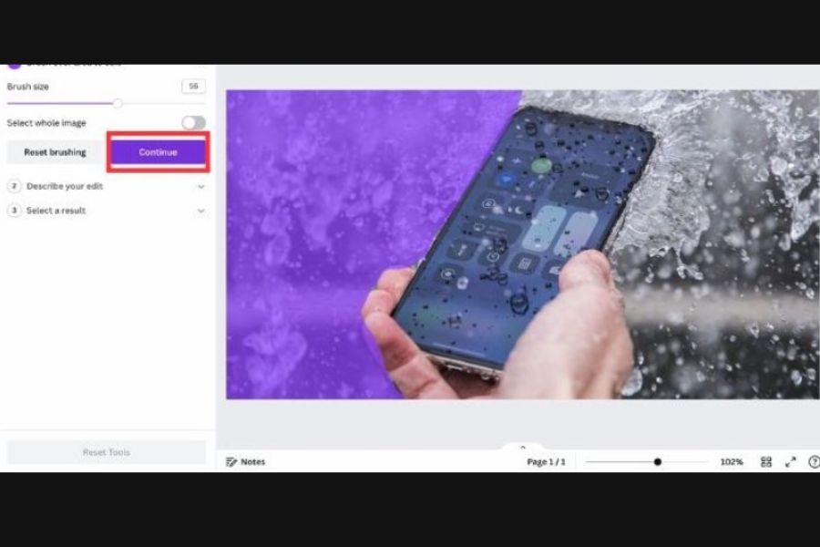Sau khi hoàn tất việc chọn vùng, bạn nhấn Continue để chuyển sang bước tiếp theo. Canva sẽ ghi nhận khu vực bạn đã chọn và sẵn sàng áp dụng chỉnh sửa theo yêu cầu.