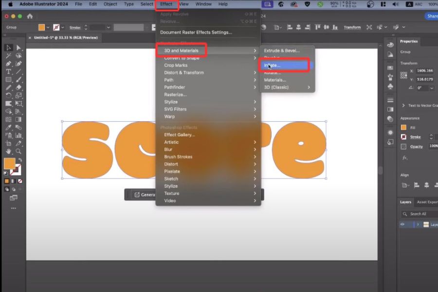 Khi đối tượng đã sẵn sàng, bạn chọn nó và vào menu Effect, tiếp tục chọn 3D and Materials rồi nhấn vào Inflate. Ngay lập tức, Illustrator sẽ tạo hiệu ứng phồng cho đối tượng, giúp hình khối trông nổi và có chiều sâu hơn so với thiết kế phẳng ban đầu. Đây là bước đánh dấu sự chuyển đổi rõ rệt từ 2D sang 3D trong Ai.