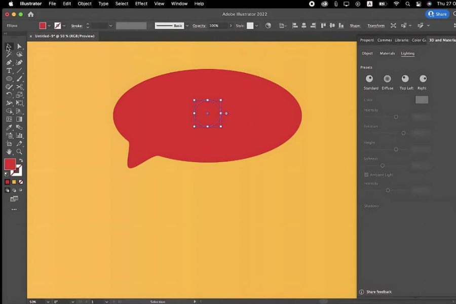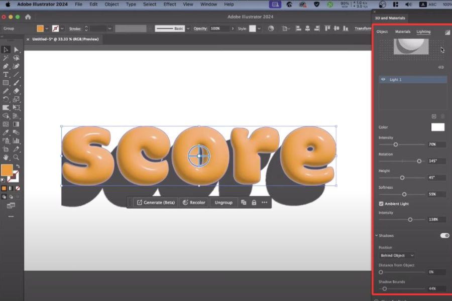 Materials và Lighting đóng vai trò quyết định đến độ chân thực của đồ họa 3D trong Illustrator. Thông qua Materials, bạn có thể lựa chọn bề mặt cho đối tượng như bóng, mờ, nhám hoặc kim loại, giúp hình khối mang đúng tinh thần thiết kế mong muốn. Vật liệu phù hợp sẽ khiến đối tượng 3D trông “thật” và có chiều sâu hơn rất nhiều.