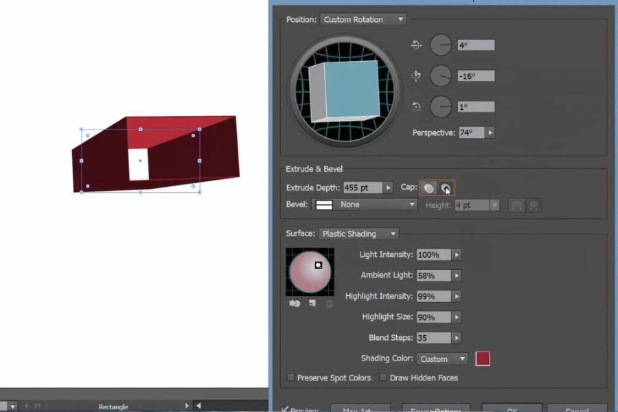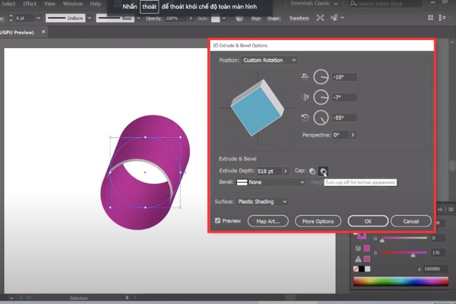 Trong bảng tùy chỉnh, hãy bật chế độ Preview để theo dõi sự thay đổi theo thời gian thực. Việc quan sát trực tiếp giúp bạn dễ dàng điều chỉnh thông số mà không cần thử lại nhiều lần. Cách làm này vừa tiết kiệm thời gian, vừa giúp bạn kiểm soát hiệu ứng 3D trong Illustrator chính xác hơn.