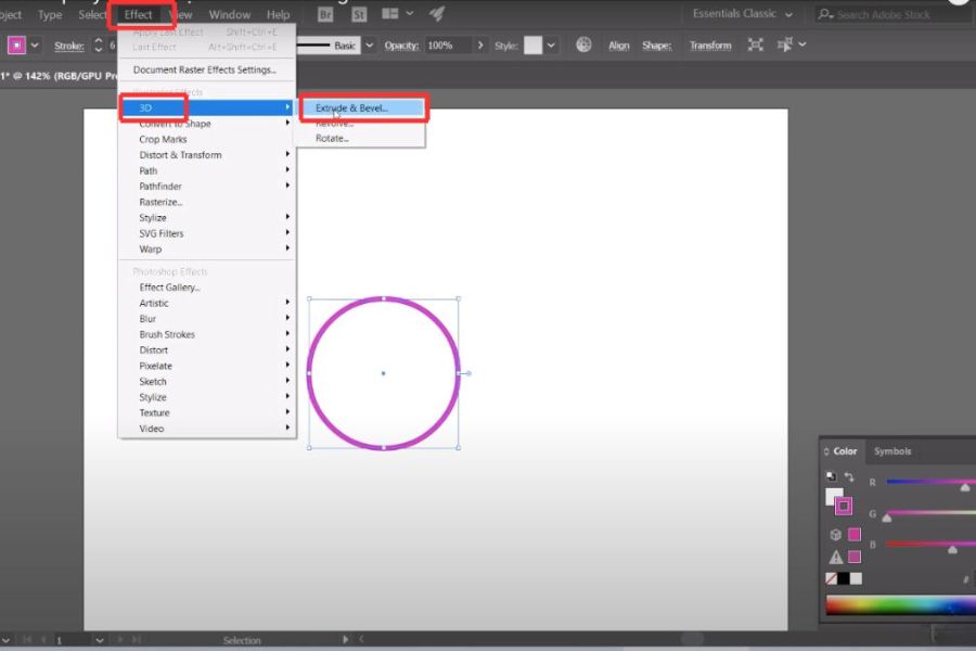 Khi đối tượng đã sẵn sàng, bạn vào menu Effect, chọn 3D and Materials rồi nhấn vào Extrude & Bevel để mở bảng điều khiển. Ngay khi hiệu ứng được áp dụng, Illustrator sẽ tự động tạo chiều sâu cho đối tượng, giúp bạn hình dung rõ ràng hơn về không gian 3D. Đây là thời điểm bạn bắt đầu bước vào quá trình dựng khối thực sự.