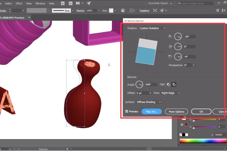 Tiếp theo, bạn có thể hoàn thiện bằng cách chỉnh Lighting và Surface để tạo ánh sáng, độ bóng và chiều sâu cho vật thể. Nếu muốn tăng tính sáng tạo, Map Art cho phép bạn gán họa tiết hoặc nhãn lên bề mặt 3D, rất phù hợp khi thiết kế chai lọ hoặc bao bì sản phẩm. Đây là bước cuối cùng giúp đối tượng 3D trong Illustrator trở nên sinh động, chuyên nghiệp và có tính ứng dụng cao.