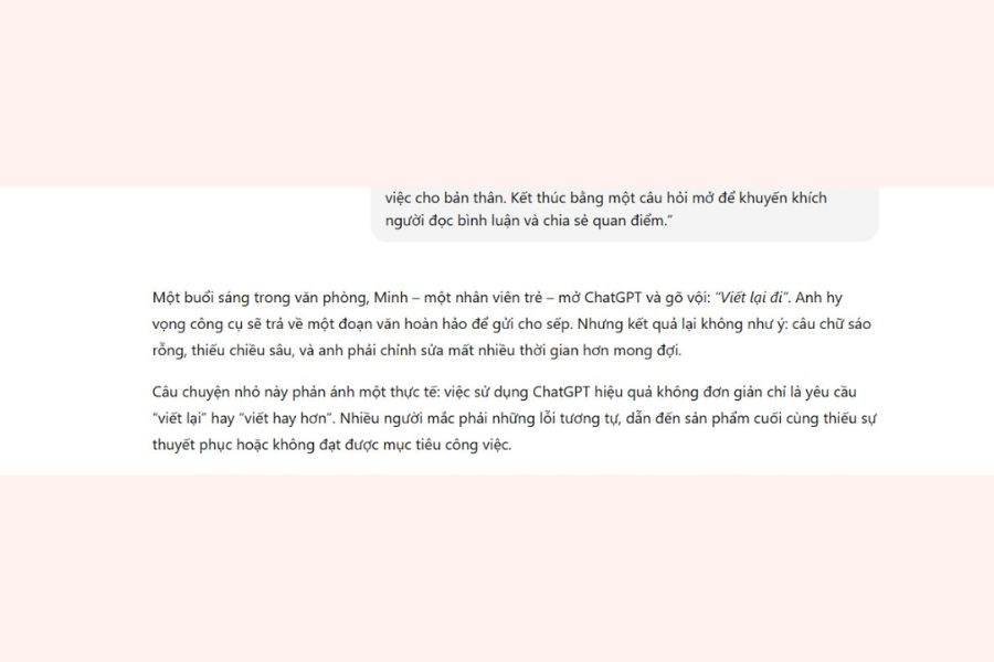 Cách khắc phục rất đơn giản là hãy mô tả rõ bạn muốn “viết lại theo hướng nào”. Ví dụ: “Hãy viết lại đoạn văn sau bằng giọng văn truyền cảm hứng, dễ đọc, độ dài khoảng 200 – 250 từ. Đối tượng độc giả là [nhập thông tin], mục tiêu là giúp họ [giải quyết một nỗi đau nào đó]. Giữ nội dung chính nhưng bổ sung ví dụ thực tế để tăng sức thuyết phục.” Khi đó, ChatGPT sẽ không chỉ làm nhiệm vụ “chỉnh câu”, mà còn tái cấu trúc toàn bộ đoạn văn theo phong cách mới, tạo ra một phiên bản sống động, cảm xúc và dễ chạm tới người đọc hơn rất nhiều.