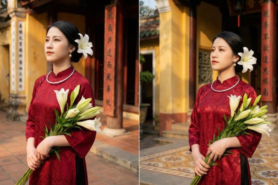 Phong cách này rất phù hợp nếu bạn muốn có bộ ảnh áo dài Tết mang vẻ đẹp truyền thống, nhẹ nhàng, dễ sử dụng để đăng mạng xã hội hoặc lưu giữ làm kỷ niệm đầu năm.