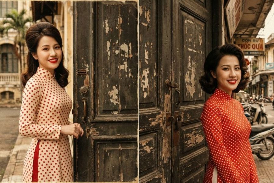 Áo dài phong cách “Cô ba Sài Gòn” gợi nhớ hình ảnh thiếu nữ Sài Gòn xưa với nét đẹp cổ điển, nữ tính và đầy hoài niệm. Đặc trưng của phong cách này là áo dài chiết eo, tay raglan, họa tiết chấm bi hoặc gạch bông, kết hợp cùng tone màu ấm và hiệu ứng ảnh film. Nếu bạn yêu thích sự khác biệt và muốn bộ ảnh Tết mang màu sắc vintage, đây là lựa chọn rất đáng thử.