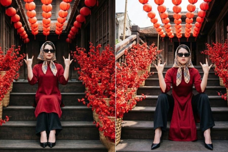 Nếu bạn không thuộc tuýp “bánh bèo truyền thống” mà yêu thích sự cá tính, năng động và muốn bộ ảnh Tết mang màu sắc khác biệt, thì phong cách áo dài phá cách này chắc chắn rất hợp với bạn. Sự kết hợp giữa áo dài lụa đỏ cách tân, quần ống rộng, kính râm và khăn trùm đầu mang hơi hướng street style sẽ tạo nên hình ảnh vừa đậm không khí Tết, vừa hiện đại và rất thời trang. Prompt này đặc biệt phù hợp để tạo ảnh đăng mạng xã hội, mang vibe “fashionista” nhưng vẫn giữ được tinh thần Á Đông.