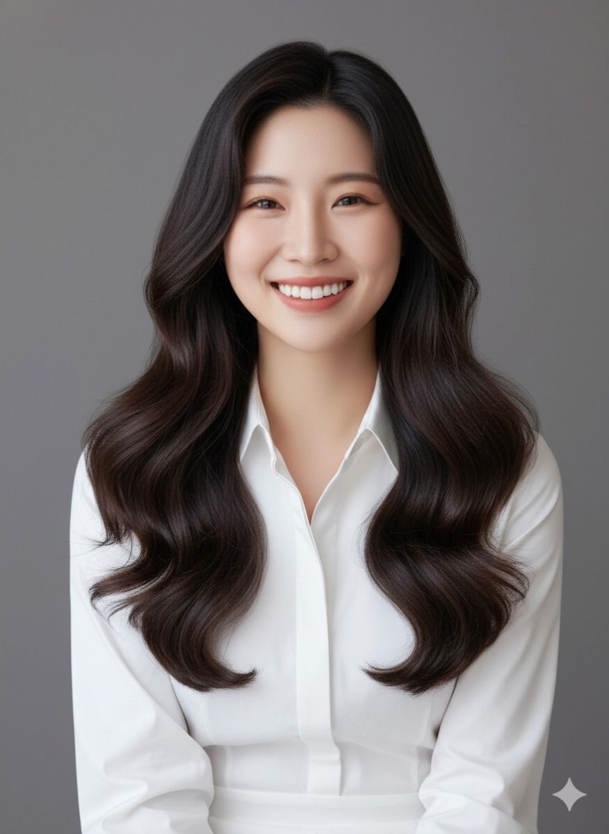 Sử dụng ảnh tham chiếu đã tải lên. Tạo ảnh chân dung cận cảnh phong cách studio, nền xám trơn, ánh sáng dịu, tập trung vào gương mặt. Giữ bố cục cận mặt, người mẫu nhìn thẳng chính diện, cười tươi tự nhiên, thể hiện sự tự tin và vui vẻ. Tóc dài uốn xoăn sóng to trẻ trung. Trang phục tối giản, áo sơ mi trắng dáng dài cổ đức. Tông màu trung tính, hiện đại, sang trọng. Độ nét cao, phong cách chân dung beauty/fashion.