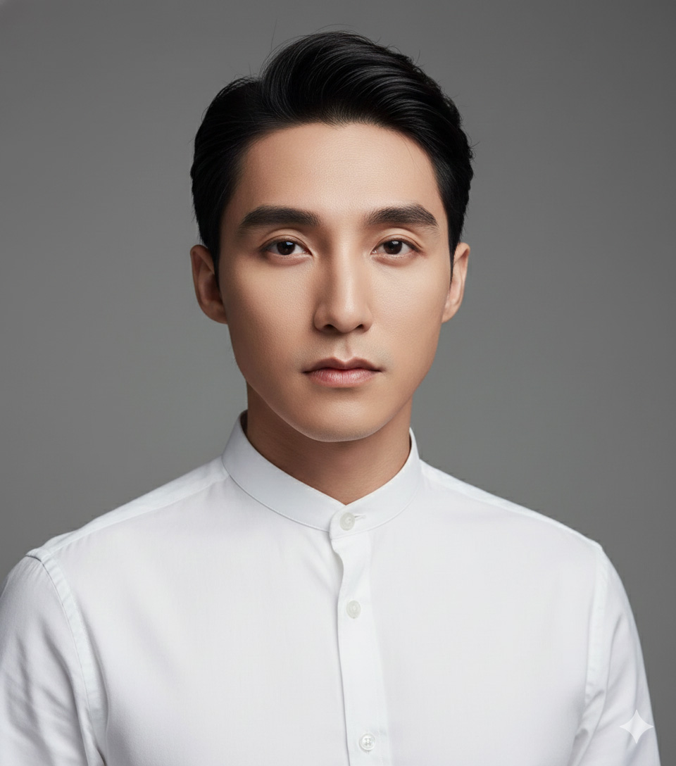 Sử dụng ảnh tham chiếu đã tải lên. Tạo ảnh chân dung cận cảnh phong cách studio, nền xám trơn, ánh sáng dịu và cân bằng. Giữ bố cục cận mặt, nam người mẫu nhìn thẳng vào camera với biểu cảm tự tin - calm & masculine. Tóc vuốt nhẹ gọn gàng. Trang phục: áo sơ mi trắng cổ đứng, phom vừa vặn, không phụ kiện. Tông màu trung tính, sạch và sắc nét. Mang vibe minimal - elegant - fashion portrait, chất lượng studio cao cấp.