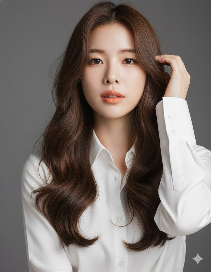 Các ngón tạo khoảng hở để ánh sáng lọt qua.Mang vibe beauty – editorial, rất trend..Ánh mắt hướng camera, môi mỉm nhẹ.Tạo cảm giác mềm mại, nữ tính. Tóc dài uốn xoăn sóng to trẻ trung. Trang phục tối giản, áo sơ mi trắng dáng dài cổ đức. Tông màu trung tính, hiện đại, sang trọng. Độ nét cao, phong cách chân dung beauty/fashion.